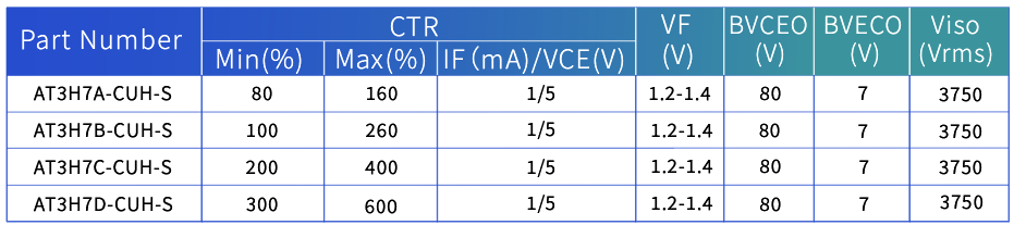 作为隔离器件的核心指标,AT3H7系列的隔离电压达到3750Vrms,远超常规应用需求,能有效隔离高低压电路,避免高压侧干扰侵入低压控制回路,为系统安全筑牢第一道防线。同时,其集电极-发射极击穿电压BVCEO≥80V,确保在复杂电压环境下不会出现击穿失效,提升了电路的容错率。